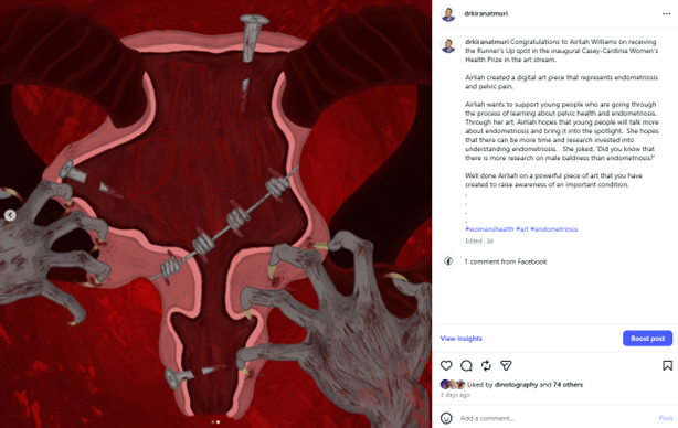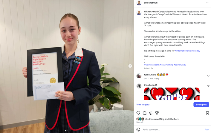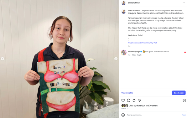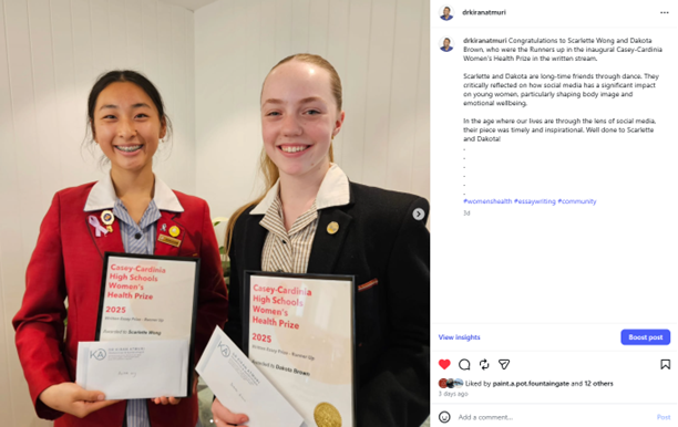 We run a unique initiative that aims to inspire high school students to get involved in women’s health through art and writing. Long-term change begins with the youth. In 2025, we had the inaugral ‘Casey-Cardinia High Schools Women’s Health Prize’. You can learn more about the prize here: https://drkiranatmuri.com.au/casey-cardinia-high-schools-womens-health-prize/
